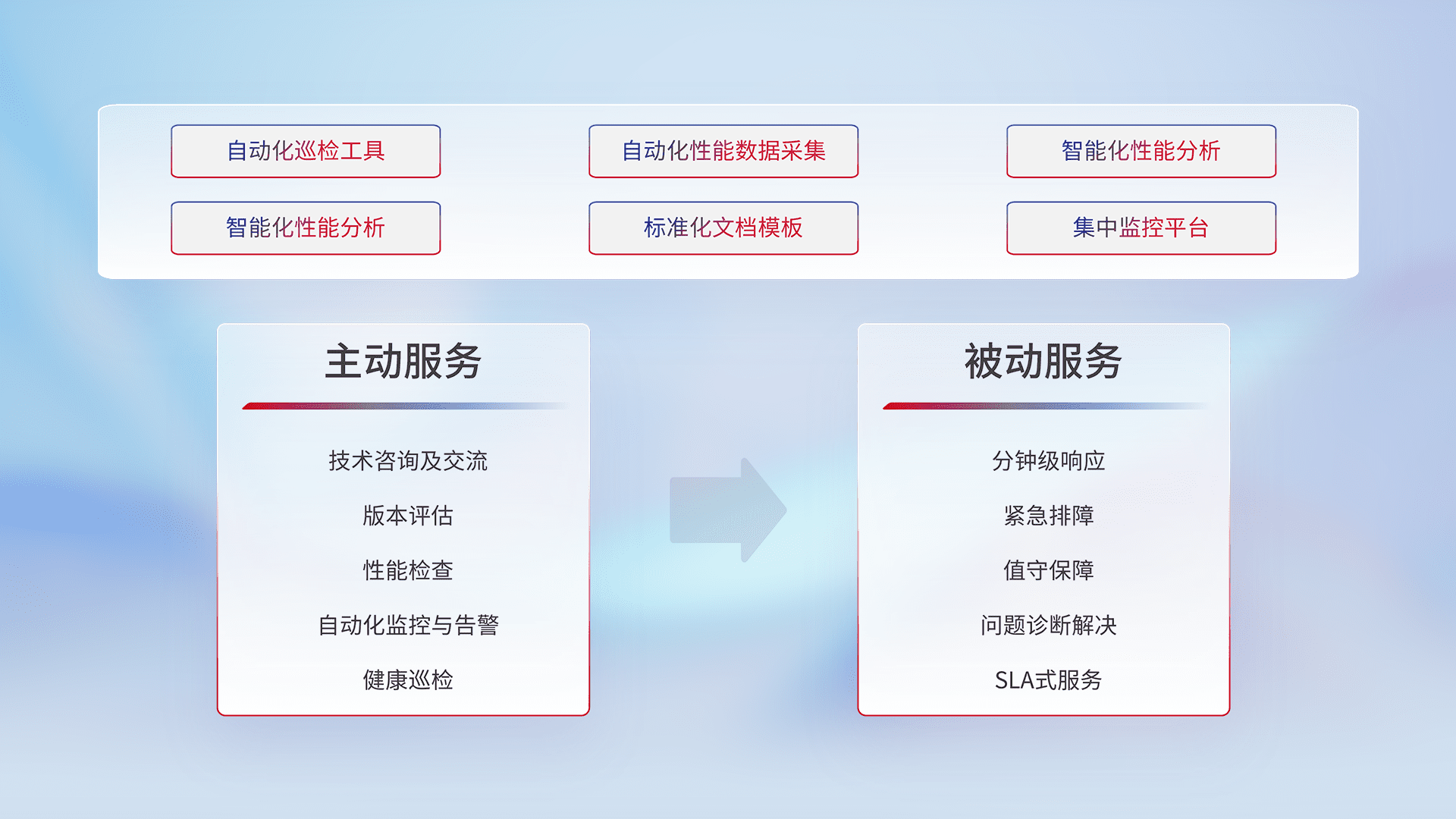 智能化工具和标准化文档,,,保障服务质量,,,,提供主动服务(包含技术咨询、、、、版本评估、、、性能检查、、自动化监控与告警、、健康巡检)和被动服务包含(分钟级响应、、、、紧急排障、、、值守保障、、问题诊断解决、、SLA服务)。。。。
